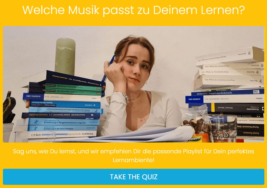 Deine Lernsessions in der Klausurenphase könnten ein bisschen mehr Stimmung vertragen? Beantworte die fünf Fragen in unserem Quiz und wir stellen dir eine Playlist zusammen, die perfekt zu Dir und Deinem Lerntyp passt!