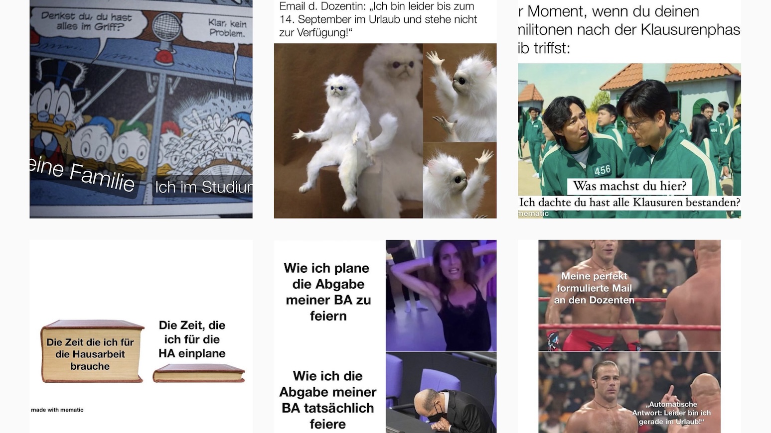 Was Einsendungen angeht, bin ich sehr offen. Das hatte ich am Anfang auch beim Konzept meiner Seite gedacht. Ich finde es auch interessant, dass mir viele Leute etwas schicken. Ich habe einen Kreis von vier bis fünf Leuten, die schicken mir wöchentlich etwas. Oder Leute, die einfach Ideen teilen, wie man ein Template nutzen kann. Meine Standards sind auch nicht so hoch, weil ich es interessant finde, was andere Studierende denken – ich bin ja nicht der einzige Studierende. Diskriminierende oder verletzende Inhalte poste ich natürlich nicht und ein Meme sollte einfach verständlich sein.