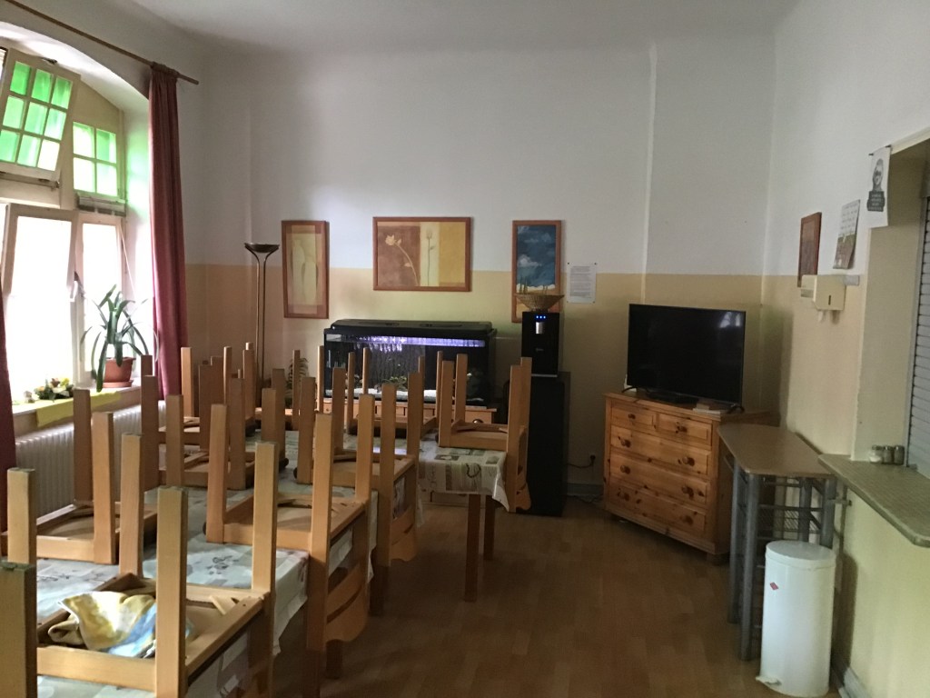 Gulde: Genau. Das ist etwas, wo wir noch so viel tun können. Wir haben es nicht in der Hand, ob wir ein neues Haus finden, das so gut geeignet ist, dass wir unsere Arbeit dort noch besser machen können. Zum Beispiel, indem wir es behindertengerecht einrichten. Für Alte und Kranke ist so ein Treppenhaus ohne Lift – wie hier – fast nicht mehr zu überwinden. Manche sitzen eigentlich nur noch in ihren Zimmern und kommen nur zu Arztterminen herunter. Sie schaffen es nicht mal mehr zu Mahlzeiten herunter, weil die Treppe wirklich schlimm ist. Wir haben inzwischen auch Menschen, die außerhalb des Hauses auf einen Rollstuhl angewiesen sind. Auch die Bäder sind nicht behindertengerecht. Es gibt sehr kleine Zimmer und sehr große Zimmer; es ist alles sehr unfair aufgeteilt. Aufgrund der baulichen Situation können wir momentan auch keine Frauen mehr aufnehmen, nur noch Männer. Die Frauendusche im Keller ist eben nicht mehr zugänglich: der Keller ist wegen Schimmel gesperrt. Das macht es nicht leicht. Unsere große Angst ist immer: Wenn das mal schief geht und wir mal eher ausziehen müssen, als wir etwas Neues haben, wissen wir nicht, was mit der Einrichtung passiert.