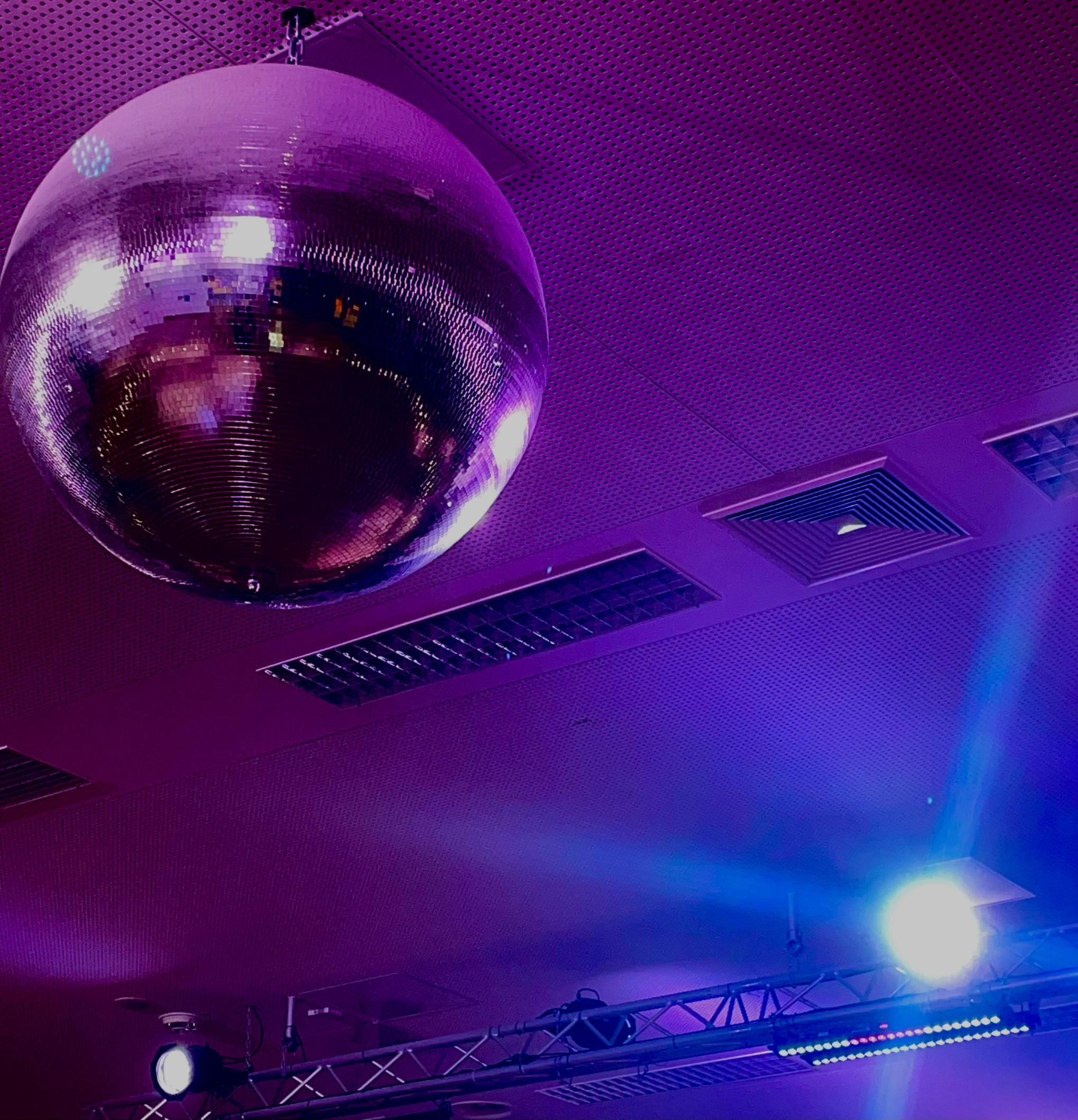 anderen Ende des Saals am Göttinger Hochschulsport. Die glitzernde Discokugel an der