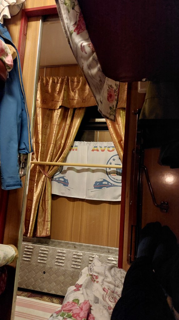 Die Liege ist nicht sonderlich groß oder breit, aber sie hat genug Platz, dass ich mich mit meinen 1,78 Metern bequem ausstrecken kann. und Irgendwann öffnet sich die Tür zu unserem Abteil. Ein Schaffner, der es sich offenbar schon gemütlich gemacht hat, denn er trägt keine Dienstkleidung und steht mit einem Paar blauer Badesandalen in unserem Abteil, verlangt nach unseren Tickets. Mit uns dreien spricht er Englisch. Viktor spricht er auf Russisch an. Wir zeigen ihm die Fahrkarten und mit einem wuchtigen Rumms schließt er wieder die Tür zum Abteil.