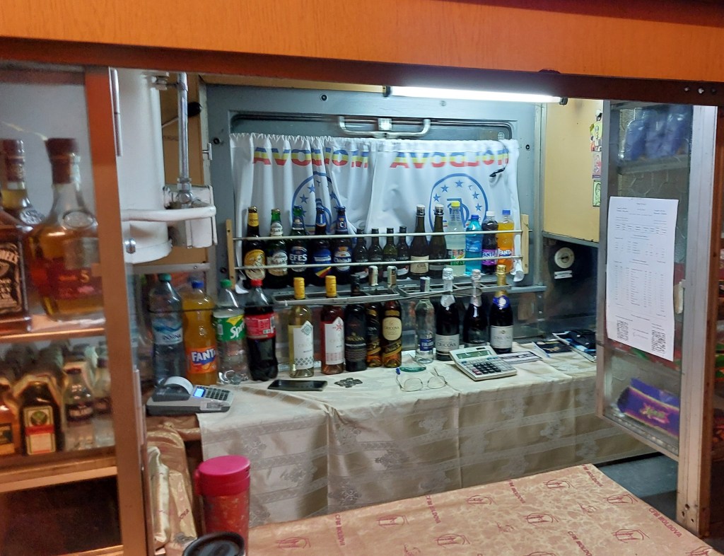 Etwas später entscheiden wir uns zum Speisewagen zu gehen. Ein etwas runderer Mann steht hinter der Theke und isst gerade wohl sein eigenes Abendessen, während er ein YouTube-Video schaut. Wir stellen uns an und er fragt uns, was wir möchten. Selbstverständlich auf Rumänisch. Glücklicherweise hat Andi nicht nur österreichische Spirituosen dabei, sondern spricht auch noch Rumänisch. Und dann hat er auch noch rumänisches Bargeld dabei, da der Wagen keine Karte akzeptiert. Wir bestellen ein Bier und stoßen an auf die gute Reise.